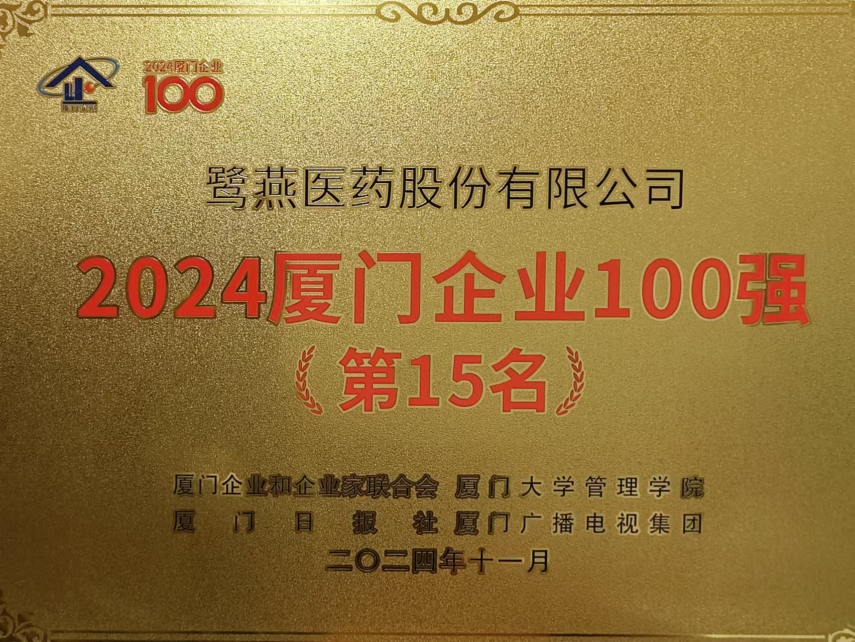 2024年11月,廈門企業(yè)和企業(yè)家聯(lián)合會(huì)發(fā)布2024廈門企業(yè)百?gòu)?qiáng)榜單,鷺燕醫(yī)藥股份有限公司榮列第15位!