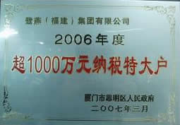 2007年3月9日,廈門市思明區(qū)在國際會(huì)展中心召開2006年度納稅大戶表彰大會(huì),鷺燕(福建)集團(tuán)喜獲“2006年度超1000萬元納稅特大戶”榮譽(yù)稱號(hào)。